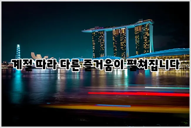 가을에는/헌터 페스티벌, 크리스마스 마켓, 새해 맞이 불꽃 축제등이 열리며, 도시 곳곳이 아름답게 장식됩니다. 이 시기 여행은 좀 더 감성적이고 낭만적인 경험을 할 수 있어 반응이 따뜻하죠. 또한, 연말 특성상 많은 호텔과 관광지에서는 할인 프로모션을 진행하니, 예산이 걱정되는 여행객에게는 좋은 기회입니다. 모두에게 추천하는 것은 바로 리버 사파리와 야시장 투어로, 축제 분위기를 만끽하며 싱가포르의 밤을 즐겨보세요.